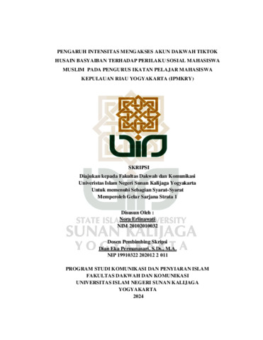 Nora Erlinawati, NIM.: 20102010032 (2024) PENGARUH INTENSITAS MENGAKSES AKUN DAKWAH TIKTOK HUSAIN BASYAIBAN TERHADAP PERILAKU SOSIAL MAHASISWA MUSLIM PADA PENGURUS IKATAN PELAJAR MAHASISWA KEPULAUAN RIAU YOGYAKARTA (IPMKRY). Skripsi thesis, UIN SUNAN KALIJAGA YOGYAKARTA.