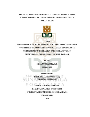 Irma Nur Rahmy, S.H., NIM.: 22203011027 (2024) RELASI ISLAM DAN MODERNITAS: STUDI PEMAHAMAN WANITA KARIER TERHADAP HADIS TENTANG PEMILIHAN PASANGAN DALAM ISLAM. Masters thesis, UIN SUNAN KALIJAGA YOGYAKARTA.