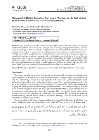 Ali Mahfuz Munawar, - and Marhumah, - and Abdul Haris, - (2024) Mutasyābihāt Hadith According Ibn Hajar al-‘Asqalani in His Fath al-Bārī Syarh Shahih Bukhari (Study of Understanding of Hadith). Al Quds Jurnal Studi Alquran dan Hadis, 8 (1). pp. 209-222. ISSN ISSN 2580-3174 (p), 2580-3190 (e)