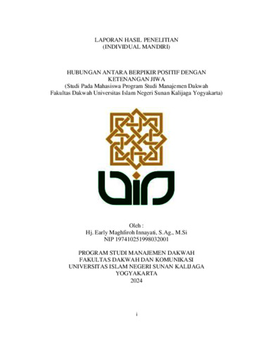 Early Maghfiroh Innayati, - (2024) Hubungan Antara Berpikir Positif Dengan Ketenangan Jiwa (studi pada mahasiswa program studi Manajemen Dakwah Fakultas Dakwah dan Komunikasi UIN Sunan Kalijaga Yogyakarta. Project Report. Prodi Manajemen Dakwah, Fakultas Dakwah dan Komunikasi UIN Sunan Kalijaga Yogyakarta, Yogyakarta.