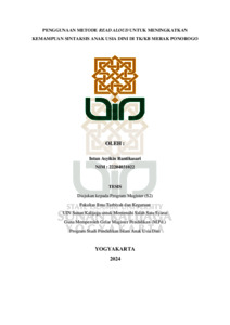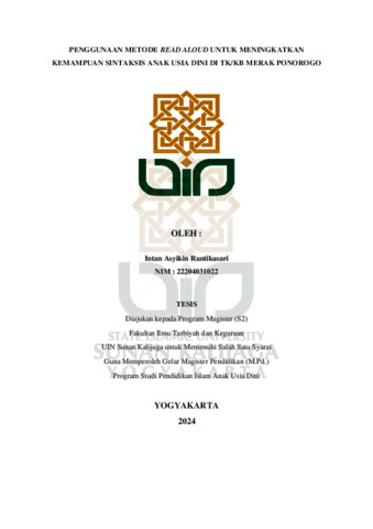 Intan Asyikin Rantikasari, NIM.: 22204031022 (2024) PENGGUNAAN METODE READ ALOUD UNTUK MENINGKATKAN KEMAMPUAN SINTAKSIS ANAK USIA DINI DI TK/KB MERAK PONOROGO. Masters thesis, UIN SUNAN KALIJAGA YOGYAKARTA.