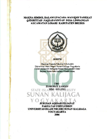 Zuhuruz Zarqo', NIM.: 00510392 (2006) MAKNA SIMBOL DALAM UPACARA MANAQIB TAREKAT QADIRIYYAH- NAQSABANDIYAH DESA LIMBANGAN KECAMATAN LOSARI KABUPATEN BREBES. Skripsi thesis, UIN SUNAN KALIJAGA YOGYAKARTA.
