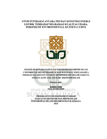 Izzatun Nada, NIM.: 20108010099 (2024) STUDI INTERAKSI ANTARA FDI DAN KONSUMSI ENERGI LISTRIK TERHADAP DEGRADASI KUALITAS UDARA: PERSPEKTIF ENVIRONMENTAL KUZNETS CURVE. Skripsi thesis, UIN SUNAN KALIJAGA YOGYAKARTA.