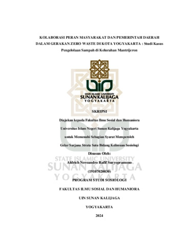 Aldrich Noveandro Rafif Suryopramono, NIM.: 19107020030 (2024) KOLABORASI PERAN MASYARAKAT DAN PEMERINTAH DAERAH DALAM GERAKAN ZERO WASTE DI KOTA YOGYAKARTA : Studi Kasus Pengelolaan Sampah di Kelurahan Mantrijeron. Skripsi thesis, UIN SUNAN KALIJAGA YOGYAKARTA.