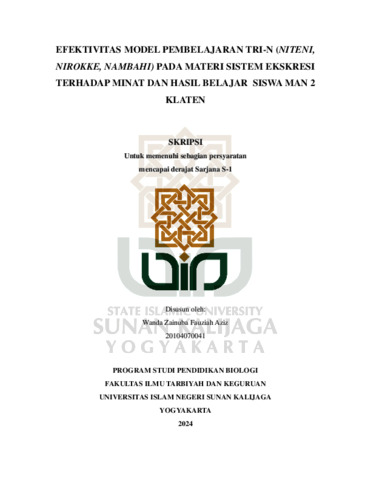 Wanda Zainuba Fauziah Aziz, NIM.: 20104070041 (2024) EFEKTIVITAS MODEL PEMBELAJARAN TRI-N (NITENI, NIROKKE, NAMBAHI) PADA MATERI SISTEM EKSKRESI TERHADAP MINAT DAN HASIL BELAJAR SISWA MAN 2 KLATEN. Skripsi thesis, UIN SUNAN KALIJAGA YOGYAKARTA.