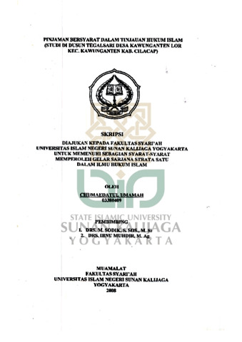 Chumaedatul Umamah, NIM.: 03380409 (2008) PINJAMAN BERSYARAT DALAM TINJAUAN HUKUM ISLAM (STUDI DI DUSUN TEGALSARI DESA KA WUNGANTEN LOR KEC. KA WUNGANTEN KAB. CILACAP). Skripsi thesis, UIN SUNAN KALIJAGA YOGYAKARTA.