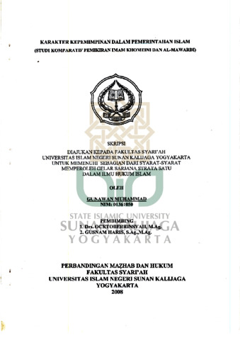 Gunawan Muhammad, NIM.: 01361050 (2008) KARAKTER KEPEMIMPINAN DALAM PEMERINTAHAN ISLAM (STUDI KOMPARATIF PEMIKIRAN IMAM KHOMEINI DAN AL-MAWARDI). Skripsi thesis, UIN SUNAN KALIJAGA YOGYAKARTA.