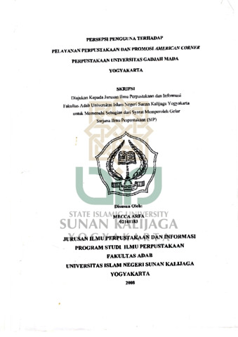 Mecca Arfa, NIM.: 02141183 (2008) PERSEPSI PENGGUNA TERHADAP PELAYANAN PERPUSTAKAAN DAN PROMOSU AMERICAN CORNER PERPUSTAKAAN UNIVERSITAS GAJAH MADA YOGYAKARTA. Skripsi thesis, UIN SUNAN KALIJAGA YOGYAKARTA.