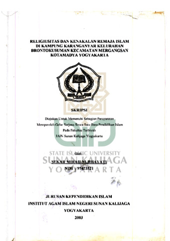 Sekar Mirah Nurhayati, NIM.: 97473521 (2003) RELIGIUSITAS DAN KENAKALAN REMAJA ISLAM DI KAMPUNG KARANGANY AR KELURAHAN BRONTOKUSUMAN KECAMA TAN MERGANGSAN KOTAMADYA YOGYAKARTA. Skripsi thesis, UIN SUNAN KALIJAGA YOGYAKARTA.