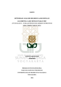 Uswatun Khasanah, NIM.: 20106010018 (2024) OPTIMISASI ANALISIS REGRESI LASSO DENGAN ALGORITMA LARS MENGGUNAKAN BIC (Studi Kasus : Jumlah penduduk miskin di provinsi Jawa Timur tahun 2022). Skripsi thesis, UIN SUNAN KALIJAGA YOGYAKARTA.