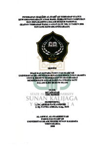 Mu'awanah, NIM.: 04350102 (2008) PENERAPAN MAQASID AL-SYARIAH TERHADAP STATUS KEWARGANEGARAAN ANAK HASIL PERKAWINAN CAMPURAN DAN IMPLIKASINYA DALAM HUKUM NASIONAL (KAJAN TERHADAP PASAL 6 AYAT (1) UU NO. 12 TAHUN 2006 TENTANG KEWARGANEGARAAN). Skripsi thesis, UIN SUNAN KALIJAGA YOGYAKARTA.