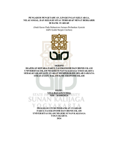 Nama : Viya Hayatun Nisa, NIM.: 20108020124 (2024) PENGARUH PENGETAHUAN, LINGKUNGAN KELUARGA, NILAI SOSIAL, DAN RELIGIUSITAS TERHADAP MINAT BERKARIR DI BANK SYARIAH. Skripsi thesis, UIN SUNAN KALIJAGA YOGYAKARTA.