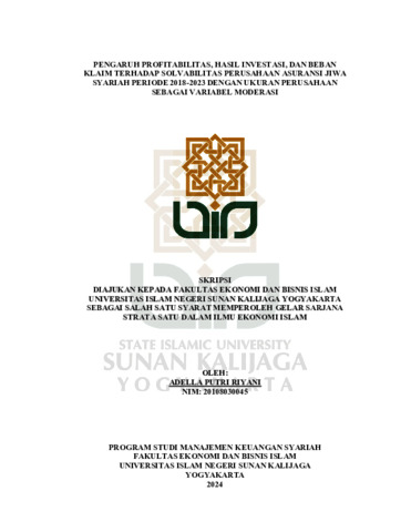Adella Putri Riyani, NIM.: 20108030045 (2024) PENGARUH PROFITABILITAS, HASIL INVESTASI, DAN BEBAN KLAIM TERHADAP SOLVABILITAS PERUSAHAAN ASURANSI JIWA SYARIAH PERIODE 2018-2023 DENGAN UKURAN PERUSAHAAN SEBAGAI VARIABEL MODERASI. Skripsi thesis, UIN SUNAN KALIJAGA YOGYAKARTA.