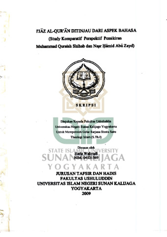 Haris Wahyudi, NIM.: 04531569 (2009) I'JAZ AL-QUR'AN DITINJAU DARI ASPEK BAHASA (STUDI KOMPARATIF PERSPEKTIF PEMIKIRAN MUHAMMAD QURAISH SHIHAB DAN NASR HAMID ABU ZYAD). Skripsi thesis, UIN SUNAN KALIJAGA YOGYAKARTA.