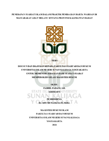 Fadhil Fadani, NIM.: 22203011071 (2024) PENERAPAN SYARIAT ISLAM DALAM PRAKTIK PEMBAGIAN HARTA WARISAN DI MASYARAKAT ADAT MELAYU SINTANG PROVINSI KALIMANTAN BARAT. Masters thesis, UIN SUNAN KALIJAGA YOGYAKARTA.