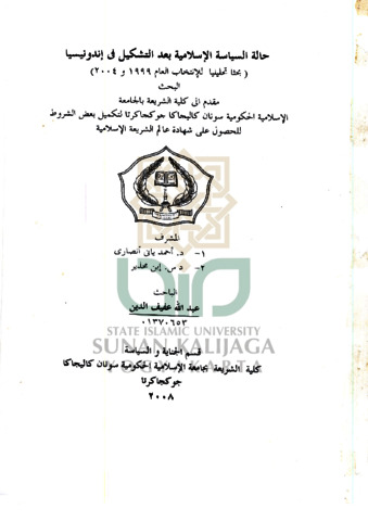 Abdullah Afifuddin, NIM.: 01370653 (2008) Halah Al Siyasah Al Islamiyah Ba'd Tashkil Fi Indonesia: Bahtha Tahliliya Li intihab Al ‘am 1999 wa 2004. Skripsi thesis, UIN SUNAN KALIJAGA YOGYAKARTA.