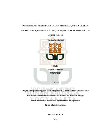 Najwa Al-Husda, NIM.: 22205031013 (2024) DOMESTIKASI PEREMPUAN DALAM MEME AL-QUR’AN DI AKUN @THESUNNAH_PATH DAN @THEQURAN_PATH TERHADAP Q.S. AL-AHZAB (33): 33 (KAJIAN SEMIOTIKA). Masters thesis, UIN SUNAN KALIJAGA YOGYAKARTA.