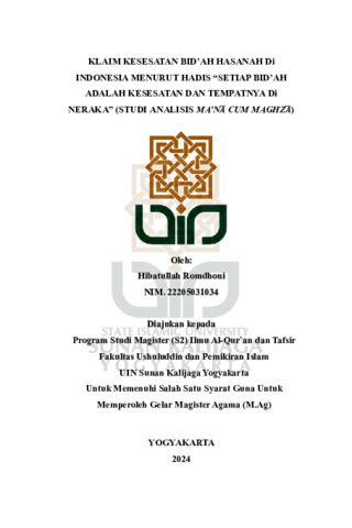 Hibatullah Romdhoni, NIM.: 22205031034 (2024) KLAIM KESESATAN BID’AH HASANAH Di INDONESIA MENURUT HADIS “SETIAP BID’AH ADALAH KESESATAN DAN TEMPATNYA Di NERAKA” (STUDI ANALISIS MA’NA CUM MAGHZA). Masters thesis, UIN SUNAN KALIJAGA YOGYAKARTA.