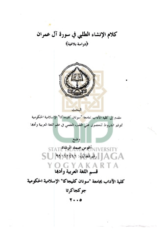 Agus Somad Arrosad, NIM.: 99112416 (2005) KALAM AL INSHA' AL TALIBI FI SURAH ALI IMRAN : Dirasat Balaghiyyah. Skripsi thesis, UIN SUNAN KALIJAGA YOGYAKARTA.