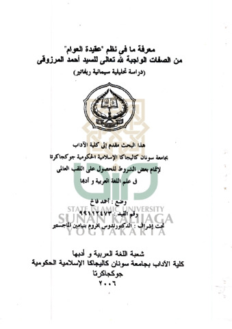 Ahmad Falih, NIM.: 99112473 (2006) MA'RIFAT MA FI NIZAM “ ’AQIDAH AL ‘AWAM” MIN AL SIFAT AL WAJIBAH ALLOHUTA’ALA LI SAYYID AHMAD AL MARZUQI (Dirasah Tahliliyyah Sima’iyyah Riffatere). Skripsi thesis, UIN SUNAN KALIJAGA YOGYAKARTA.