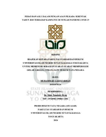 Muhammad Yasin Farhan, NIM.: 20103070124 (2024) PERAN BAWASLU DALAM PENGAWASAN PILKADA SERENTAK TAHUN 2020 TERHADAP KAMPANYE DI TENGAH PANDEMI COVID-19. Skripsi thesis, UIN SUNAN KALIJAGA YOGYAKARTA.