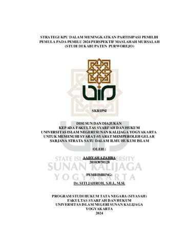 Aaisyah Azahra, NIM.: 20103070128 (2024) STRATEGI KPU DALAM MENINGKATKAN PARTISIPASI PEMILIH PEMULA PADA PEMILU 2024 PERSPEKTIFMASLAHAHMURSALAH (STUDI DI KABUPATEN PURWOREJO). Skripsi thesis, UIN SUNAN KALIJAGA YOGYAKARTA.