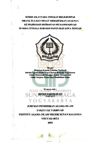 Khusni Rakhmawati, NIM.: 99414313 (2004) KORELASI ANTARA TINGKAT RELIGIUSITAS ORANG TUA DAN MINAT MEMASUKKAN ANAKNYA KE MADRASAH IBTIDAIYAH MUHAMMADIYAH DI DESA CINDAGA KEBASEN BANYUMAS JAWA TENGAH. Skripsi thesis, UIN SUNAN KALIJAGA YOGYAKARTA.