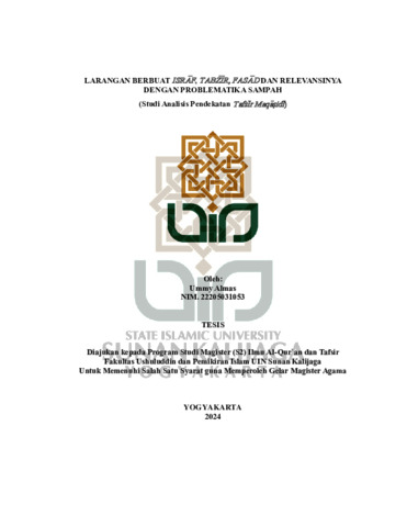 Ummy Almas, NIM.:22205031053 (2024) LARANGAN BERBUAT ISRAF, TABZIR, FASAD DAN RELEVANSINYA DENGAN PROBLEMATIKA SAMPAH (Studi Analisis Pendekatan Tafsir Maqasidi). Masters thesis, UIN SUNAN KALIJAGA YOGYAKARTA.