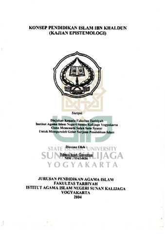 Ikhsan Syah Gunawan, NIM.: 99414436 (2004) KONSEP PENDIDIKAN ISLAM MENURUT IBN KHALDUN (Kajian Epistemologi). Skripsi thesis, UIN SUNAN KALIJAGA YOGYAKARTA.