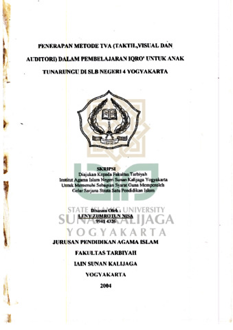 Leny Zumrotun Nisa, NIM.: 99414326 (2004) PENERAPAN METODE TVA (TAKTIL, VISUAL DAN AUDITORI) DALAM PEMBELAJARAN IQRO’ UNTUK ANAK TUNARUNGU DI SLB NEGERI 4 YOGYAKARTA. Skripsi thesis, UIN SUNAN KALIJAGA YOGYAKARTA.
