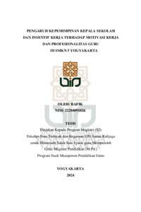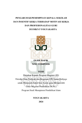 Rafik, NIM.: 22204091026 (2024) PENGARUH KEPEMIMPINAN KEPALA SEKOLAH DAN INSENTIF KERJA TERHADAP MOTIVASI KERJA DAN PROFESIONALITAS GURU DI SMKN 5 YOGYAKARTA. Masters thesis, UIN SUNAN KALIJAGA YOGYAKARTA.
