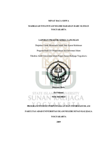 Evi Sulami, NIM.: 06130025 (2009) MINAT BACA SISWA MADRASAH TSNAWIYAH NEGERI BABADAN BARU SLEMAN YOGYAKARTA. Laporan D3 thesis, UIN SUNAN KALIJAGA YOGYAKARTA.