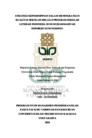 Khalid Husain Abdurrahman, NIM.: 20104090066 (2024) STRATEGI KEPEMIMPINAN DALAM MENINGKATKAN KUALITAS SEKOLAH MELALUI PROGRAM SEKOLAH LITERASI INDONESIA DI SD MUHAMMADIYAH SIDOREJO GUNUNGKIDUL. Skripsi thesis, UIN SUNAN KALIJAGA YOGYAKARTA.