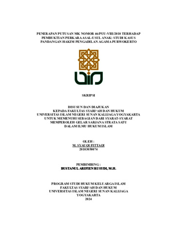 M. Syauqi Fittaqi, NIM.: 20103050074 (2024) PENERAPAN PUTUSAN MK NOMOR 46/PUU-VIII/2010 TERHADAP PEMBUKTIAN PERKARA ASAL-USUL ANAK: STUDI KASUS PANDANGAN HAKIM PENGADILAN AGAMA PURWOKERTO. Skripsi thesis, UIN SUNAN KALIJAGA YOGYAKARTA.