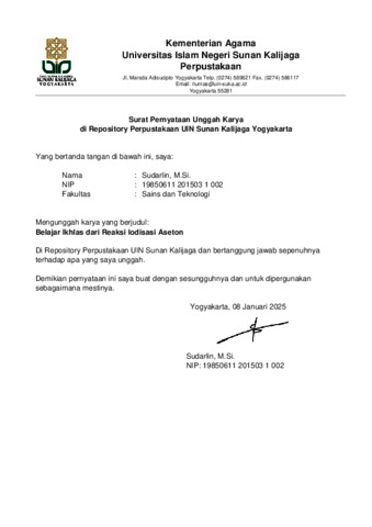 | Uncontrolled Keywords: | Ikhlas, Reaksi, Iodisasi, Aseton |