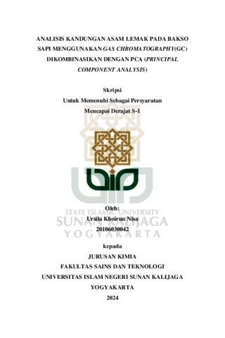 Ursila Khoirun Nisa, NIM.: 20106030042 (2024) ANALISIS KANDUNGAN ASAM LEMAK PADA BAKSO SAPI MENGGUNAKAN GAS CHROMATOGRAPHY(GC) DIKOMBINASIKAN DENGAN PCA (PRINCIPAL COMPONENT ANALYSIS). Skripsi thesis, UIN SUNAN KALIJAGA YOGYAKARTA.