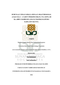 Pury Rahmawati, NIM.: 20104030034 (2024) HUBUNGAN TEMAN SEBAYA DENGAN SIKAP PROSOSIAL ANAK USIA 4 – 6 TAHUN PERSEPSI ORANG TUA SISWA DI RA ABDUL BARRI KECAMATAN BAMBANGLIPURO KABUATEN BANTUL. Skripsi thesis, UIN SUNAN KALIJAGA YOGYAKARTA.