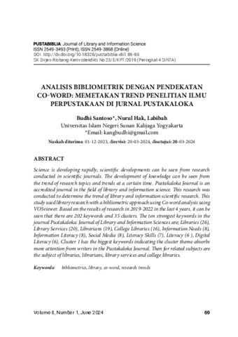 Budhi Santoso, - and Nurul Hak, - and Labibah, - (2024) ANALISIS BIBLIOMETRIK DENGAN PENDEKATAN CO-WORD MEMETAKAN TREND PENELITIAN ILMU PERPUSTAKAAN DI JURNAL PUSTAKALOKA. Pustabiblia: Journal of Library and Information Science, 8 (1). pp. 69-85. ISSN e-ISSN : 2549-3868 p-ISSN :2549-3493