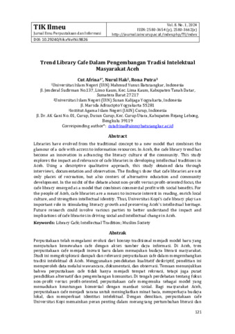 Libraries have evolved from the traditional concept to a new model that combines the glamour of a cafe with access to information resources. In Aceh, the cafe library trend has become an innovation in advancing the literacy culture of the community. This study explores the impact and relevance of cafe libraries in developing intellectual traditions in Aceh. Using a descriptive qualitative approach, this study obtained data through interviews, documentation and observation. The findings show that cafe libraries are not only places of recreation, but also centers of alternative education and community development. In the midst of the debate about non-profit versus profit-oriented focus, the cafe library emerged as a model that combines commercial profit with social benefits. For the people of Aceh, cafe libraries are a means to increase interest in reading, enrich local culture, and strengthen intellectual identity. Thus, Universitas Kopi's cafe library plays an important role in stimulating literacy growth and preserving Aceh's intellectual heritage. Future research could involve various parties to better understand the impact and implications of cafe libraries in driving social and intellectual change in Aceh. Perpustakaan telah mengalami evolusi dari konsep tradisional menjadi model baru yang menyatukan kemewahan cafe dengan akses sumber daya informasi. Di Aceh, tren perpustakaan cafe menjadi inovasi baru dalam memajukan budaya literasi masyarakat. Studi ini mengeksplorasi dampak dan relevansi perpustakaan cafe dalam mengembangkan tradisi intelektual di Aceh. Menggunakan pendekatan kualitatif deskriptif, penelitian ini memperoleh data melalui wawancara, dokumentasi, dan observasi. Temuan menunjukkan bahwa perpustakaan cafe tidak hanya menjadi tempat rekreasi, tetapi juga pusat pendidikan alternatif dan pengembangan komunitas. Di tengah perdebatan tentang fokus non-profit versus profit-oriented, perpustakaan cafe mengemuka sebagai model yang memadukan keuntungan komersial dengan manfaat sosial. Bagi masyarakat Aceh, perpustakaan cafe menjadi sarana untuk meningkatkan minat baca, memperkaya budaya lokal, dan memperkuat identitas intelektual. Dengan demikian, perpustakaan cafe Universitas Kopi memainkan peran penting dalam merangsang pertumbuhan literasi dan melestarikan warisan intelektual Aceh. Penelitian mendatang dapat melibatkan berbagai pihak untuk memahami lebih dalam dampak dan implikasi perpustakaan cafe dalam menggerakkan perubahan sosial dan intelektual di Aceh.