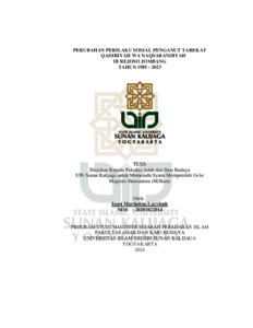 Tesis ini membahas mengenai perubahan perilaku sosial penganut tarekat. Rejoso merupaan pusat Tarekat Qadiriyah wa Naqsabandiyah di Jawa Timur tepatnya di Pondok Pesantren Darul Ulum Jombang. Tarekat Qadiriyah wa Naqsyabandiyah yang sangat berpengaruh terhadap masyarakat. Seseorang di bimbing kepada perilaku yang baik menurut ajaran Islam, karena di dalamnya mengajarkan ajaran tarekat Qadiriyah wa Naqsabandiyah yang beperan aktif untuk membentuk kepribadian Islami. Adapun fokus riset yang penulis teliti adalah (1) Bagaimana sejarah Tarekat Qadiriyah wa Naqsabandiyah di Rejoso Jombang? (2) Bagaimana perubahan perilaku sosial keagamaan pada Tarekat Qadiriyah wa Naqsabandiyah di Rejoso Jombang? (3) Mengapa terjadi perubahan perilaku sosial keagamaan pada tarekat Qadiriyah wa Naqsabandiyah di Rejoso Jombang? Penelitian ini menggunakan pendekatan sosiologi. Pendekatan ini digunakan untuk memperoleh fakta-fakta sejarah terkait dengan kondisi masyarakat di Rejoso Jombang mengenai perubahan perilaku sosial keagamaan yang disebabkan dari pengaruh suatu ajaran tarekat,sedangkan teori yang digunakan adalah teori tindakan sosial oleh Max Weber. Adapun metode yang digunakan dalam penelitian ini adalah metode penelitian sejarah yang meliputi 4 tahapan yakni heuristik, verifikasi, interpretasi, dan historiografi. Hasil penelitian ini menunjukkan bahwa: Pertama, secara historis Tarekat Qadiriyah wa Naqsabandiyah di Rejoso sebagai respon atas permasalahan sosial keagamaan masyarakat yang dianggap tidak sesuai dengan ajaran Islam. Dalam rentan tahun 1985 - 2023 kegiatan Tarekat Qadiriyah wa Naqsabandiyah semakin berkembang. Semakin banyaknya jama’ah yang di bai’at oleh mursyid untuk menjadi anggota tarekat dari berbagai daerah. Kedua, Tarekat Qadiriyah wa Naqsyabandiyah di wilayah Jawa Timur berpusat di pondok pesantren Darul Ulum Jombang yang didirikan oleh KH. Tamim dari Madura. Tarekat Qadiriyah dan Naqsabandiyah dipimpin oleh Kai Kholil dari Ahmad Hasbullah al-Maduri yang bermukim di Makkah dan diajarkan di pondok Rejoso pada tahun 1930 M. Tarekat Qadiriyah wa Naqsabandiyah di Rejoso diadakan selama setahun tiga kali, yaitu sewelasan yang diselenggarakan setiap malam 11 Muharram dan 11 Rabi’ul Akhir dan Sya’banan setiap malam 15 Sya’ban yang bertepatan dengan Nisfhu Sya’ban. Kyai Romly Tamim sebagai Mursyid Tarekat Qadiriyah wa Naqsabandiah di Rejoso pada tahun 1937 – 1958. Ketiga, erubahan perilaku sosial keagamaan penganut tarekat yaitu perilaku Sosial Keagamaan, perilaku Sosial ekonomi, dan perilaku sosial budaya. Dengan menganut tarekat dan mengamalkan ajarannya, terbukti ada perubahan sosial secara siqnifikan. Perubahan-perubahan dalam menjalankan ketaatan kepada Allah, seperti Istiqamah dalam berdzikir, mencintai mursyid, dan amar ma’ruf nahi mungkar.