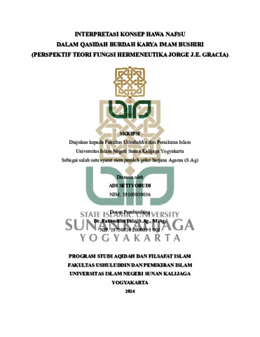 Adi Setiyobudi, NIM.: 19105010036 (2024) INTERPRETASI KONSEP HAWA NAFSU DALAM QASIDAH BURDAH KARYA IMAM BUSHIRI (PERSPEKTIF TEORI FUNGSI HERMENEUTIKA JORGE J.E. GRACIA). Skripsi thesis, UIN SUNAN KALIJAGA YOGYAKARTA.