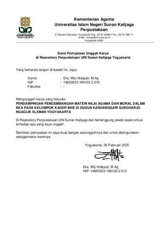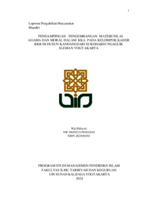Text (PENDAMPINGAN PENGEMBANGAN MATERI NILAI AGAMA DAN MORAL DALAM KKA PADA KELOMPOK KADER BKB DI DUSUN KANDANGSARI SUKOHARJO NGAGLIK SLEMAN YOGYAKARTA)