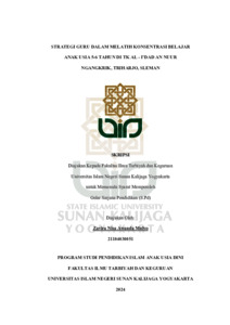 Zavira Nisa Awanda Mulyo, NIM.: 21104030051 (2024) STRATEGI GURU DALAM MELATIH KONSENTRASI BELAJAR ANAK USIA 5-6 TAHUN DI TK AL - I’DAD AN NUUR NGANGKRIK, TRIHARJO, SLEMAN. Skripsi thesis, UIN SUNAN KALIJAGA YOGYAKARTA.