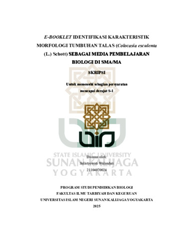 Sulistyowati Wulandari, NIM.: 21104070024 (2025) E-BOOKLET IDENTIFIKASI KARAKTERISTIK MORFOLOGI TUMBUHAN TALAS (Colocasia esculenta (L.) Schott) SEBAGAI MEDIA PEMBELAJARAN BIOLOGI DI SMA/MA. Skripsi thesis, UIN SUNAN KALIJAGA YOGYAKARTA.