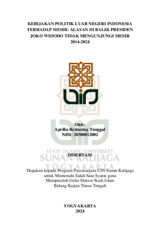 Aprilia Restuning Tunggal, NIM.: 20300012002 (2025) KEBIJAKAN POLITIK LUAR NEGERI INDONESIA TERHADAP MESIR: ALASAN DI BALIK PRESIDEN JOKO WIDODO TIDAK MENGUNJUNGI MESIR 2014-2024. Doctoral thesis, UIN SUNAN KALIJAGA YOGYAKARTA.