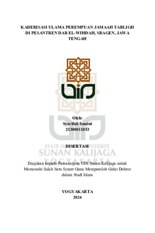 Syarifah Isnaini, NIM.: 21300011053 (2025) KADERISASI ULAMA PEREMPUAN JAMAAH TABLIGH DI PESANTREN DAR EL-WIHDAH, SRAGEN, JAWA TENGAH. Doctoral thesis, UIN SUNAN KALIJAGA YOGYAKARTA.