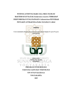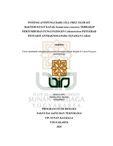 Nabilla Afira Shaibah, NIM.: 20106040017 (2025) POTENSI ANTIFUNGI DARI CELL-FREE FILTRATE BAKTERI KULIT KATAK Sumaterana crassiovis TERHADAP PERTUMBUHAN FUNGI PATOGEN Colletotrichum PENYEBAB PENYAKIT ANTRAKNOSA PADA TANAMAN CABAI. Skripsi thesis, UIN SUNAN KALIJAGA YOGYAKARTA.