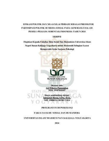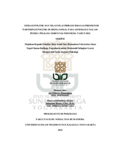 Aji Wibowo Pamungkas, NIM.: 19107010107 (2024) EFIKASI POLITIK DAN NILAI-NILAI PRIBADI SEBAGAI PREDIKTOR PARTISIPASI POLITIK DI MEDIA SOSIAL PADA GENERASI Z DALAM PEMILU-PILKADA SERENTAK INDONESIA TAHUN 2024. Skripsi thesis, UIN SUNAN KALIJAGA YOGYAKARTA.