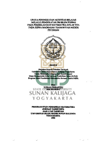 Widiah Prihatini, NIM.: 03430036-T (2006) UPAYA PENINGKATAN AKTIFITAS BELAJAR MELALUI PENDEKATAN PROBLEM POSING PADA PEMBELAJARAN MATEMATIKA KELAS VIIA PADA SISWA MADRASAH TSANAWIYAH NEGERI PIYUNGAN. Skripsi thesis, UIN SUNAN KALIJAGA YOGYAKARTA.