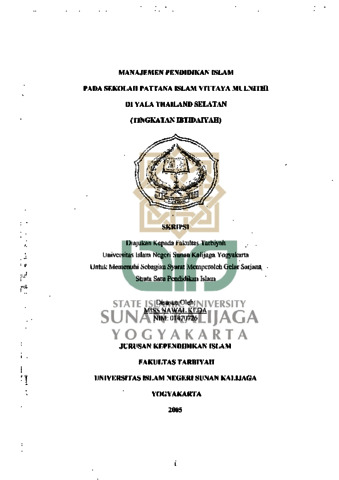 Miss Nawal Keda, NIM.: 01470726 (2005) MANAJEMEN PENDIDIKAN ISLAM PADA SEKOLAH PATTANA ISLAM VITTAYA MULNITHI DI YALA THAILAND SELATAN (TINGKATAN IBTIDAIYAH). Skripsi thesis, UIN SUNAN KALIJAGA YOGYAKARTA.